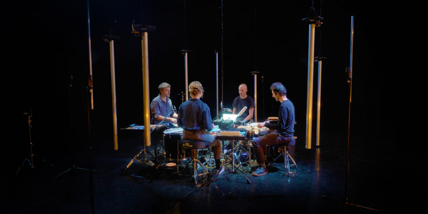 Le public est installé au cœur du dispositif, immergé dans un cercle de tubes sonores suspendus. Cette proximité avec les sources sonores permet de ressentir les vibrations et d’entrer dans une relation corporelle au son. Au centre, trois percussionnistes et des haut-parleurs diffusent des flux rythmiques entrelacés, donnant naissance à une transe sonore hypnotique. Progressivement, les douze tubes s’animent et entrent en résonance, marquant l’évolution vers une temporalité plus cyclique et minimale. La scénographie fait émerger une tension entre rythmes mécaniques, pulsations organiques et silences, invitant à une écoute profonde, presque rituelle.