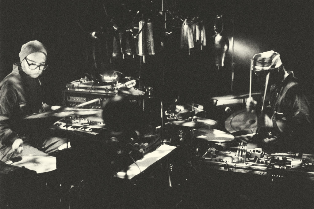 Alexis Toussaint & Romain Colautti explore herd bells, cultural and heritage objects, in a setup combining two drum kits, string tambourines and sets of bells, placed on the ground and suspended like an ‘aerial herd’.